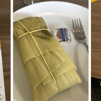 Grilled pamonha tortilla, chicken, Brazilian cottage cheese and mozzarella cheese.