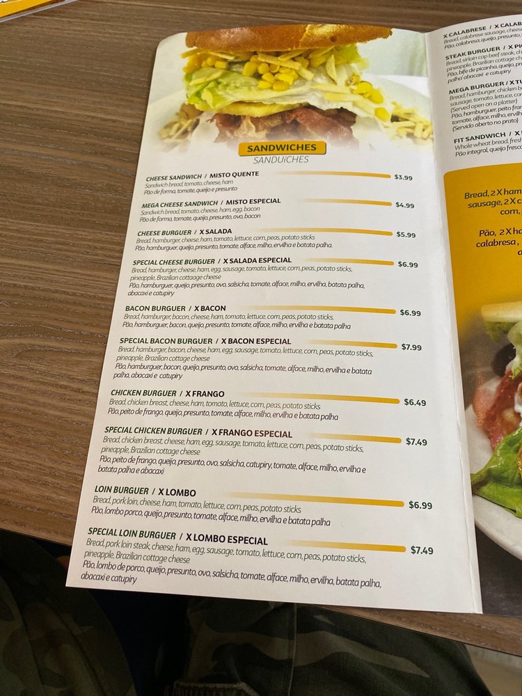 Bread, hamburger, bacon, cheese, ham, egg, sausage, tomato, lettuce, corn, peas, potato sticks, pineapple and Brazilian cottage cheese.